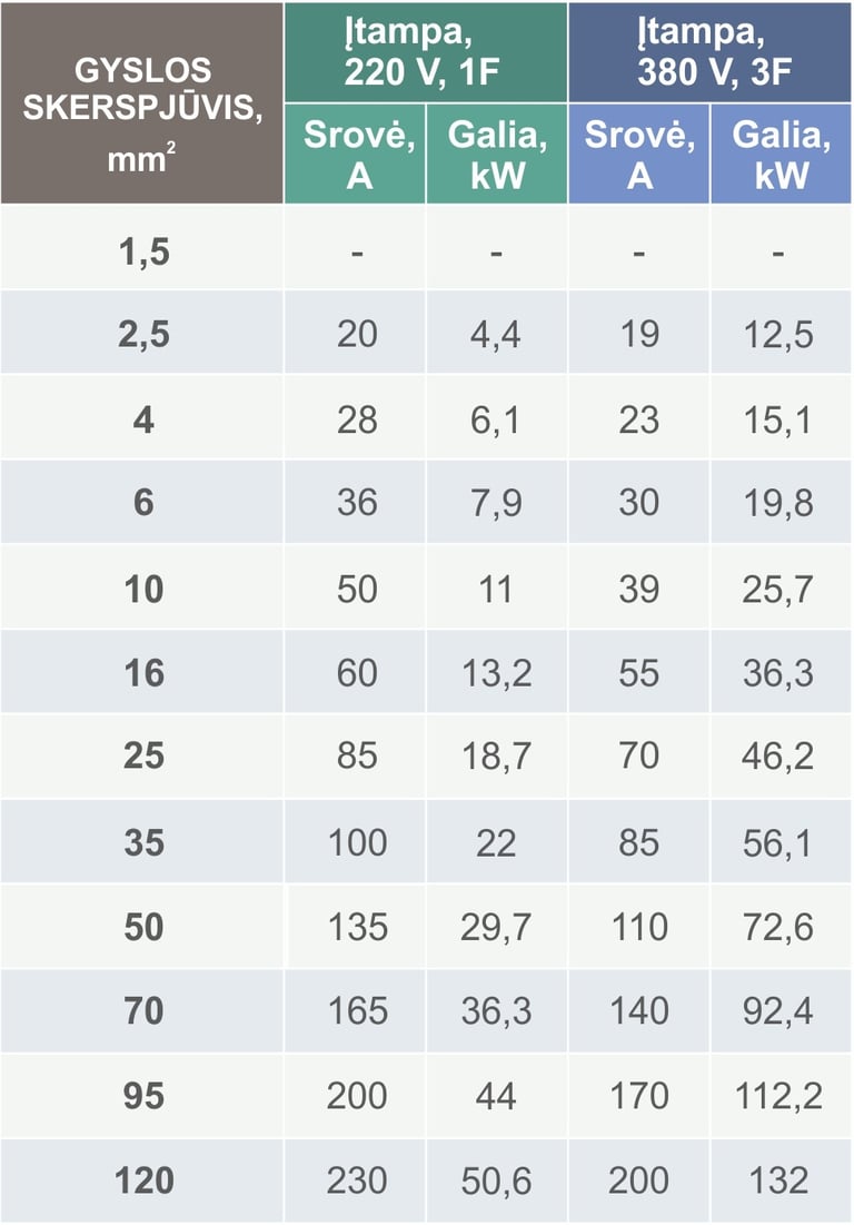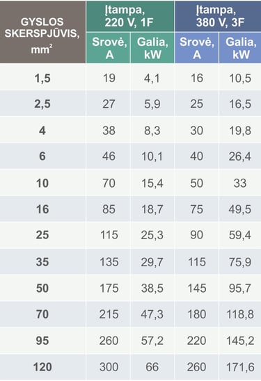 Dėmesio! Lentelėse pateikiamos leistinos kabelių apkrovos, kai kabelis tiesiamas atvirai. Jei kabelis tiesiamas vamzdžiuose kartu su kitais kabeliais, leistinas vertes reikėtų sumažinti apie 30%.