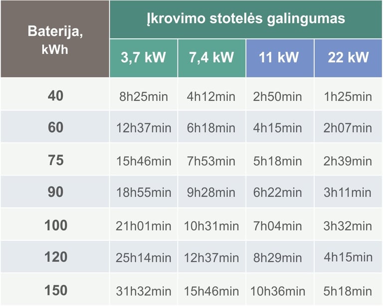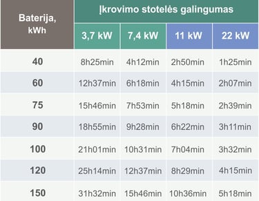 Žemiau pateikiama orientacinė įkrovimo laiko lentelė, kai baterija įkraunama nuo 10% iki 80% (t.y. 70% baterijos įkrovimo) , su 10% nuostoliu. Kai baterija pasiekia 80% įkrovimo - jos krovimo laikas ženkliai sulėtėja dėl baterijų apsaugos.