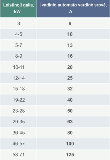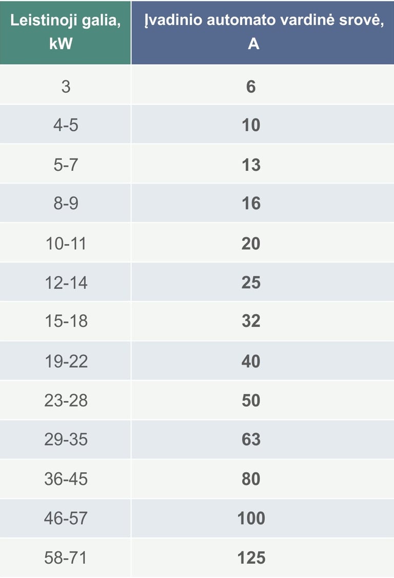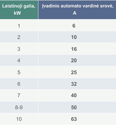 1F automatų parinkimas (230V) pagal leistiną galią